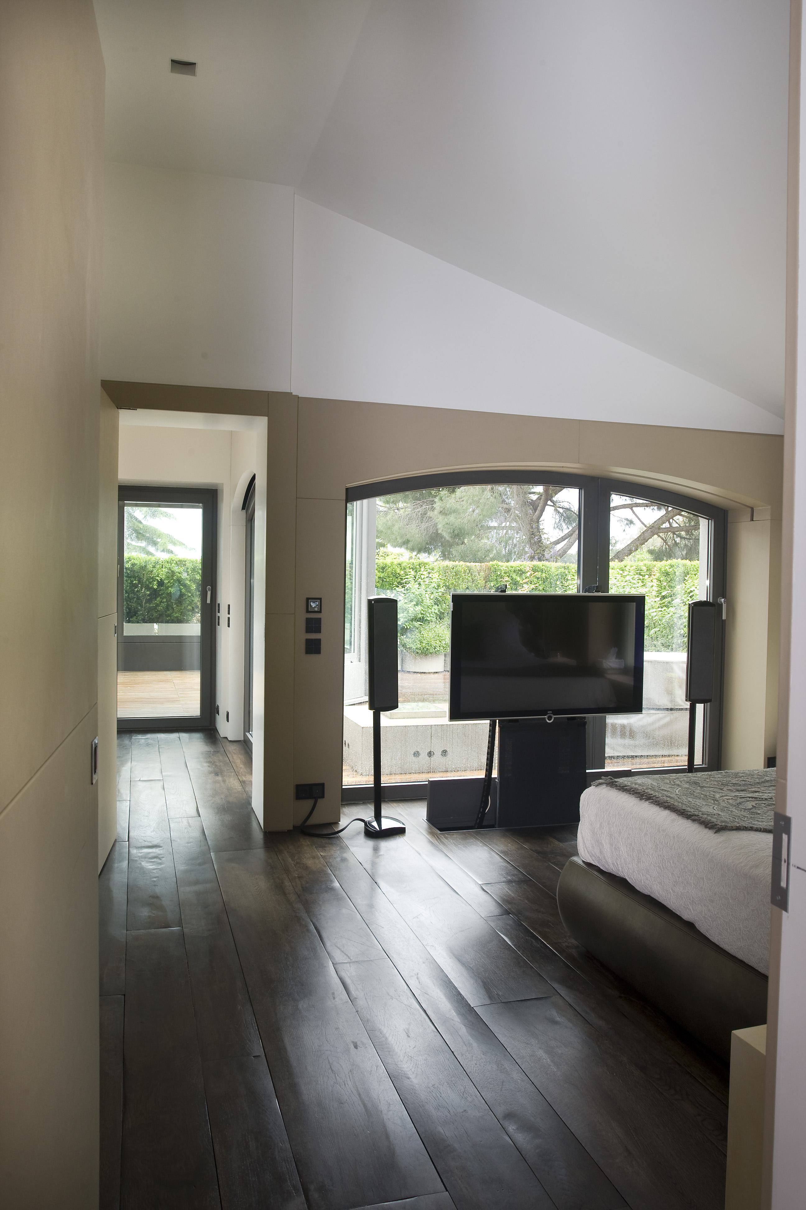 La villa sita in una zona residenziale di Roma Nord, sorge laddove prima esisteva un edificio composto da più appartamenti. La ristrutturazione ha avuto lo scopo di costituire un insieme di stanze comunicanti unite a grandi spazi esterni per privilegiare l’idea di ottenere uno spazio fluido tutto abitabile, in cui la zona dei soggiorni dialoga con l’esterno. Viene annullata in tal modo la discontinuità tra gli spazi, privilegiando la qualità architettonica.